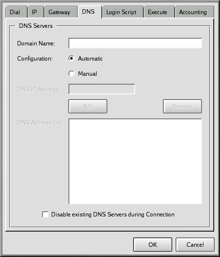 You can select the Automatic configuration option or you can select Manual and enter the DNS addresses your ISP provided you with in the DNS IP Address field. When you've finished typing in the numbers, click on Add and the numbers will be entered into the DNS Address List box. (By default, you won't be able to click on the Add button until you've entered the entire DNS number in the address field.)