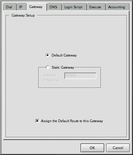 On the Gateway (see Figure 6-19) tab, select either Default Gateway or Static Gateway. If your ISP has specified an IP address you should use as a static gateway, enter that IP number in the space provided.