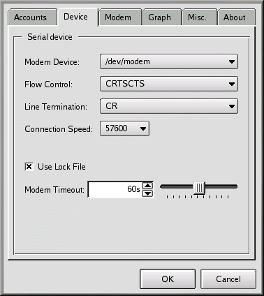 Now, it's time to provide the location and speed of your modem. Go back to the Kppp Configuration Dialog and select the Device tab (see Figure 6-24). Here, you specify where your modem is located, its baud rate, some hardware settings, and other specifics.