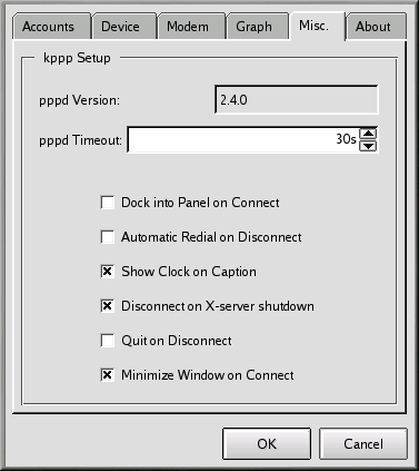 On the Misc tab, you can set options like automatic reconnection or disconnection, display of Kppp on connection, and more.
