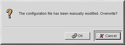 En cambio, si desea grabar la configuración de Apache, haga click en OK. Aparecerá la ventana de diálogo como la que se muestra en Figura 11-16. Si confirma esta operación, las posiciones de configuración se grabarán en el fichero /etc/httpd/conf/httpd.conf. Recuerde que se sobreescribirá el fichero de configuración original.