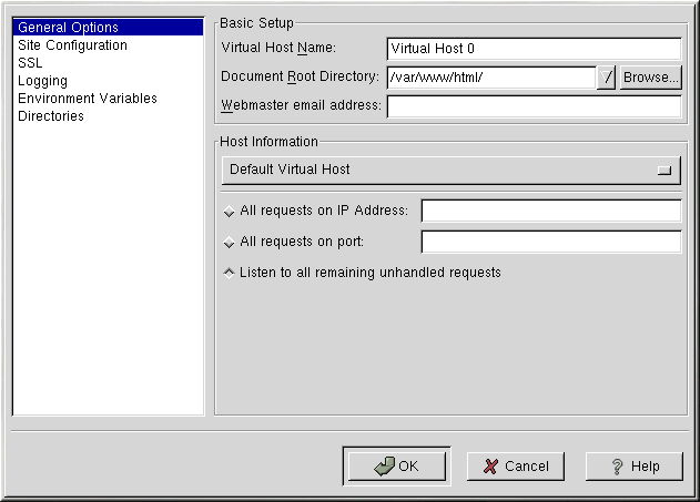 Las posiciones Opciones generales sólo se aplican a la máquina virtual que esté configurando. Escriba el nombre de la máquina virtual en Virtual Host Name. La herramienta de configuración de Apache usa este nombre para distinguirlo de otras máquinas virtuales.