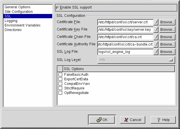 Si un servidor Apache no está configurado con el soporte SSL, la comunicación entre el servidor Apache y sus clientes no está codificada. Este hecho es apropiado para los sitios web que no contengan información confidencial. Por ejemplo, un sitio "open source" que se encarga de distribuir software y documentación no necesita comunicaciones seguras cosa que no ocurre cuando se trata de un sitio que se encarga del comercio electrónico el cual necesita el soporte SSL. Precisamente, esto significa que se puede usar el módulo de seguridad mod_ssl. Para poder utilizarlo con la herramienta de configuración de Apache tiene que permitir el acceso a través del puerto 443 yendo a Main=> Direcciones disponibles. Consulte la la sección de nombre Posiciones básicas para mayor información. Después, seleccione el nombre de la máquina virtual en Virtual Hosts, haga click en Edit, elija SSL en el menú de la izquierda y busque la opción Enable SSL Support como se muestra en el Figura 11-13. La sección SSl Configuration está ya configurada con un certificado digital el cual autentifica su servidor de web seguro e identifica el servidor seguro para los navegadores de la web. Tiene que comprar su propio certificado digital. No utilice el que viene con Red Hat Linux. Para mayor información sobre cómo comprar un certificado digital aprobado por la CA, consulte la sección Referencias sobre Apache en la versión española de la Official Red Hat Linux Reference Guide.