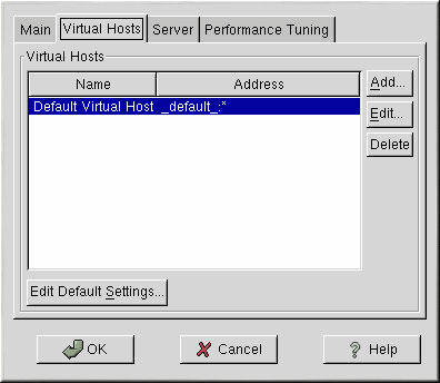 Puede usar la herramienta de configuración de Apache para configurar máquinas virtuales. Éstas le permiten ejecutar servidores diferentes para direcciones IP diferentes, nombres de máquinas diferentes o puertos distintos en la misma máquina. Por ejemplo, puede ejecutar http://www.your_domain.com y http://www.your_second_domain.com en el mismo servidor Apache utilizando máquinas virtuales. Esta opción corresponde a la directiva <VirtualHost> destinada a la máquina virtual predeterminada y las direcciones IP de éstas. Corresponde a la directiva <NameVirtualHost> para la máquina virtual basada en el nombre.