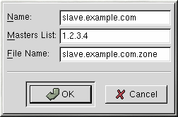 Para agregar una zona esclava (también conocida como maestra secundaria), pulse el botón Add y seleccione Slave Zone. Introduzca el nombre de dominio de la zona esclava en el área de texto Domain name.