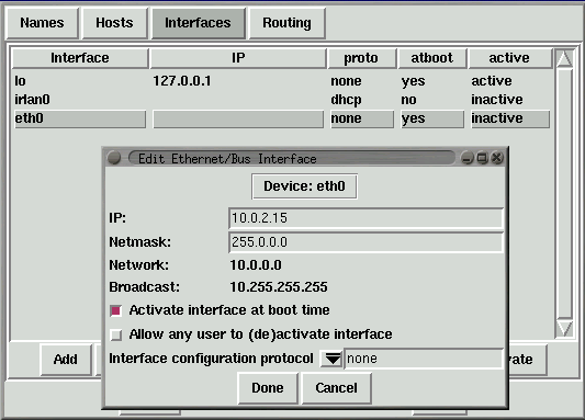 El Configurador de la red que se muestra en el Figura 15-2 le permite manipular fácilmente los parámetros tales como, direcciones IP, direcciones de puertas de enlace y direcciones de red, así como servidores de nombre y /etc/hosts.