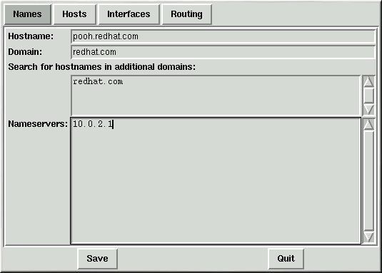 El panel del Configurador de la red de Nombres cumple dos objetivos principales: configurar el nombre del host y el dominio del ordenador y determinar qué servidor de nombres utilizará para buscar hosts en la red. El panel Names no puede configurar una máquina como un servidor de nombre. Para modificar un campo o añadir información a éste, haga click en el campo con el botón izquierdo del ratón y escriba la información nueva.