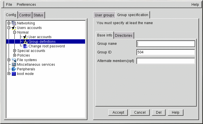 Introduzca un nombre de grupo. Asimismo, puede estar interesado en especificar los miembros del grupo; esto se realiza en el campo Alternate members. La lista de usuarios debe estar delimitada por un espacio, es decir, debe haber un espacio entre un nombre de usuario y el siguiente. Deje el campo Group name en blanco para que el sistema asigne el Group ID (GID) al nuevo grupo. Cuando haya terminado, pulse el botón Accept para que se cree el grupo.