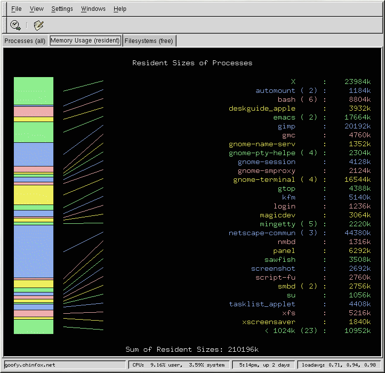 Si quiere utilizar una interfaz gráfica con el comando free, puede utilizar el Monitor del Sitema . Para iniciarlo, vaya al botón del GNOME System Monitor => Programs => System => System Monitor o teclee gtop en la línea del intérprete de comandos. Una vez hecho esto, elija la pestaña Memory Usage.