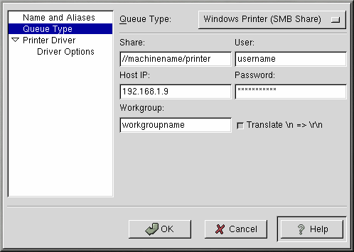 Para añadir una impresora a la cual se accede usando el protocolo SMB, pulse el botón Add en la ventana principal de la aplicación printconf. Aparecerá la ventana mostrada en el Figura 13-2. Introduzca un nombre distintivo de la impresora en el campo de texto Queue Name.Este puede ser cualquier nombre descriptivo de su impresora. También puede crear "alias" para su impresora pulsando el botón Add al lado de la lista Aliases. Consulte la sección de nombre Creación de un Alias de impresión para más información acerca de los "alias". El nombre de la impresora y los alias no deben contener espacios y deben comenzar con una letra del rango a-z o A-Z. Los caracteres válidos son rangos comprendidos entre a-z, A-Z, O-9 y los caracteres "-" y "_"