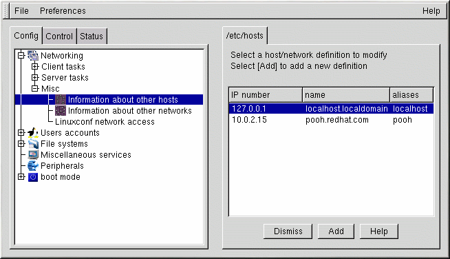 Puede agregar, modificar o eliminar entradas del fichero /etc/hosts con Linuxconf. Abra Config => Networking => Misc => Information about other hosts.