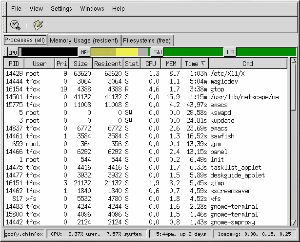 Si quiere utilizar una interfaz gráfica para top, puede utilizar el programa Monitor del Sistema GNOME . Para iniciarlo, vaya el botón del GNOME Main Menu => Programs => System => System Monitor o teclee gtop en la línea del intérprete de comandos.