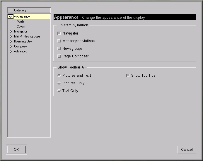 Mail & Newsgroups — Preferencias para el uso de clientes news y e-mails de Communicator. Para las instrucciones sobre la utilización de estas configuraciones, remítase a la la sección de nombre Configuraciones de Email y Noticias para Messenger.