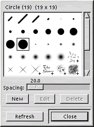 Para visualizar el diálogo Brush Selection, haga click en el pincel activo de la Toolbox. El diálogo Brush Selection se parece al Figura 9-5: