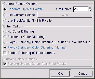 Antes de que GIMP le permita guardar una imagen como un .gif, necesitará convertirla en colores indexed o en grayscale (escala de grises). Convierta una imagen en colores indexed haciendo click con el botón de la derecha del ratón en la imagen y después seleccione Image => Mode => Indexed. Aparecerá la ventana de diálogo Indexed Color Conversion: