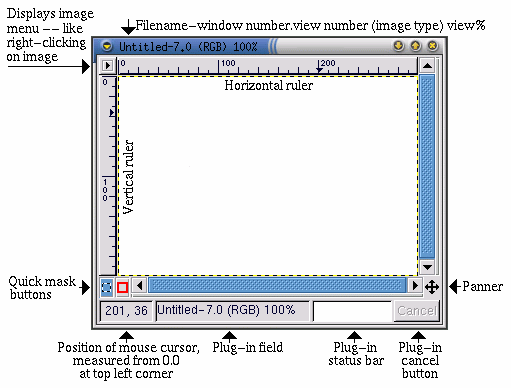 Hacia la parte de abajo de la ventana, al lado de la ventana de posición del cursor del ratón, verá dos campos de estado y después una tecla de Cancel. El primer campo de estado muestra el nombre del archivo, hasta que un "plug-in" esté funcionando (por ejemplo, si está aplicando un filtro o un Script-Fu a una imagen). Si un "plug-in" está funcionando, el nombre de éste aparecerá en la primera ventana de estado. El siguiente campo esta vacío, pero mostrará la barra de estado del enchufe que está funcionando. Por último, el botón Cancel le permite detener un enchufe que esté funcionando.