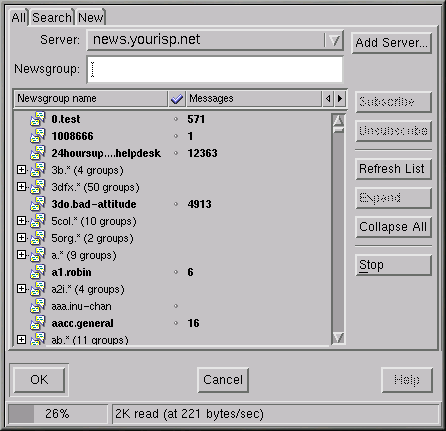Su próxima tarea será la de descargar la lista de grupos de noticias del servidor del servidor de noticias del proveedor de Internet y la de suscribirse a los grupos en los que esté interesado. Dependiendo de la velocidad de la conexión, descargar la lista de miles de grupos de noticias puede requerir mucho tiempo.