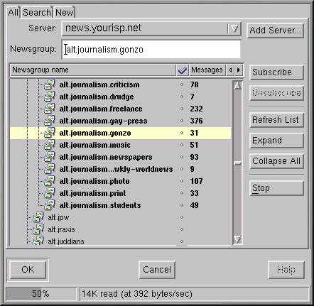 También puede buscar un grupo de noticias según sus intereses en la ventana Search. Supongamos que usted es aficionado a las noticias. En el campo Search for, introduzca journalism y pulse el botón Search Now (o bien pulse Intro). El resultado de la búsqueda probablemente será los grupos de noticias a los que puede suscribirse.