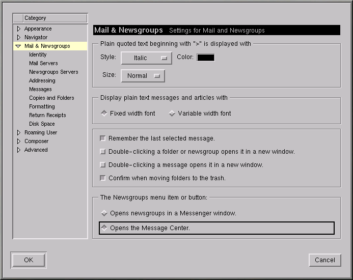 Para leer y enviar mensajes, necesitará configurar la sección Mail & Newsgroups de Communicator (Edit=>Preferences). También puede salvar otras opciones que hagan referencia a esta categoría.