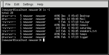 [newuser@localhost newuser]$ cd tigger bash: tigger: Permission denied [newuser@localhost newuser]$ |
