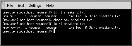 El propietario del fichero, (en este caso, el newuser) tiene los permisos para escribir y leer el fichero. El fichero no es un programa, por lo que el newuser no tiene el permiso para ejecutarlo. El grupo, newuser, tiene los permisos para escribir y leer sneakers.txt. En lo que se refiere al permiso de ejecución , el grupo newuser no tiene dicho permiso.