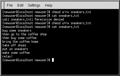[newuser@localhost newuser]$ chmod u+rw sneakers.txt [newuser@localhost newuser]$ cat sneakers.txt buy some sneakers then go to the coffee shop then buy some coffee bring the coffee home take off shoes put on sneakers make some coffee relax! [newuser@localhost newuser]$ |