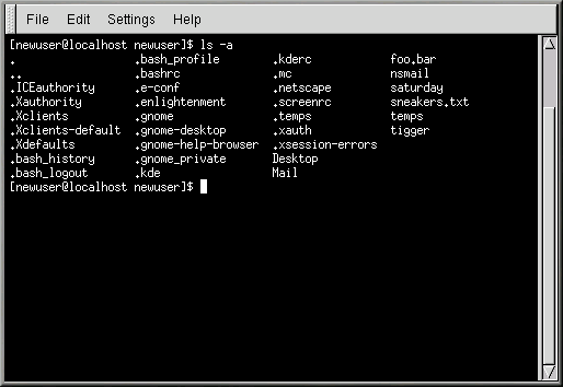 Teclee ls -a. Verá ficheros que empiezan con puntos llamados ficheros ocultos o ficheros dot.