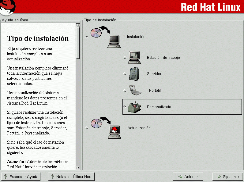 El sistema Red Hat Linux le permitirá elegir el tipo de instalación que mejor se ajuste a sus necesidades. Sus opciones serán: Estación de trabajo, Servidor, Personalizada, o Actualización.