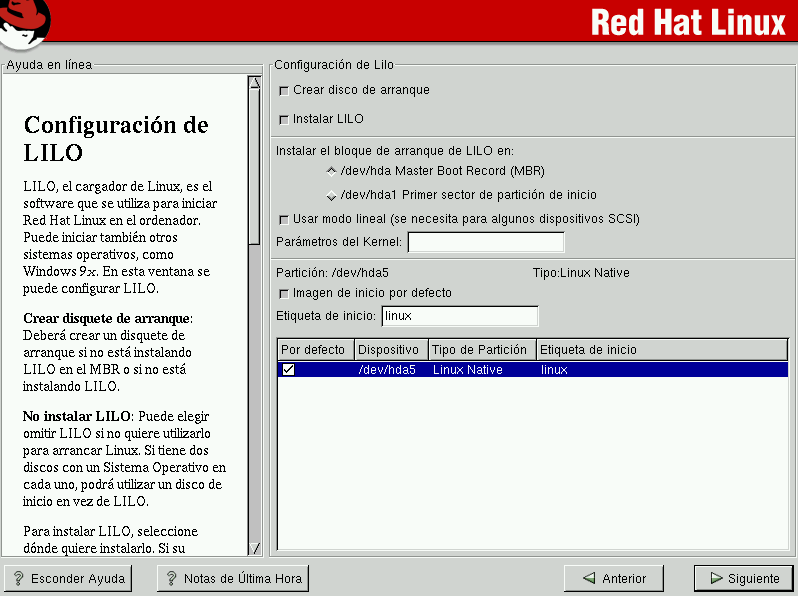 Para poder arrancar su sistema Red Hat Linux debería instalar LILO (the LInux LOader). Puede instalar LILO en dos sitios:
