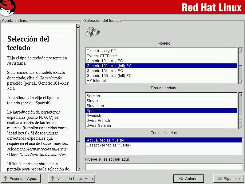 Para modificar el tipo de teclado después de la instalación, debería convertirse en root o superusuario y utilizar el comando /usr/sbin/kbdconfig, o teclear setup en el indicador de comandos de root. Para convertirse en root, teclee su - en el indicador de comandos de la shell en una ventana del terminal y pulse Intro. Entonces, introduzca la contraseña de root y pulse Intro. |