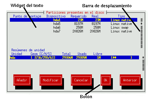 Widget de texto — los widgets de texto son regiones de la ventana para la visualización del texto. A veces, los widgets de texto pueden contener otros widgets, tales como casillas de verificación. Si un widget de texto contiene más información de la que puede visualizar en el espacio reservado para ello, aparecerá una barra de desplazamiento. Si posiciona el cursor en el widget del texto, puede utilizar las teclas de flechas Arriba y Abajo para desplazarse a través de toda la información disponible. Su posición actual será mostrada en la barra de desplazamiento por el carácter #, que mueve arriba y abajo la barra de desplazamiento al desplazarse.