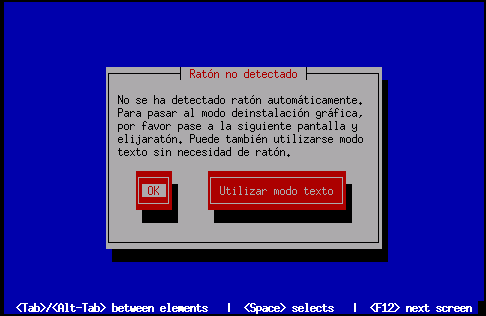 El programa de instalación intenta en primer lugar ejecutarlo en modo frame buffer. Si esto no funciona, intentará ejecutarlo en un modo de resolución más bajo. Si este segundo intento también fracasa, el programa se ejecutará en modo texto.