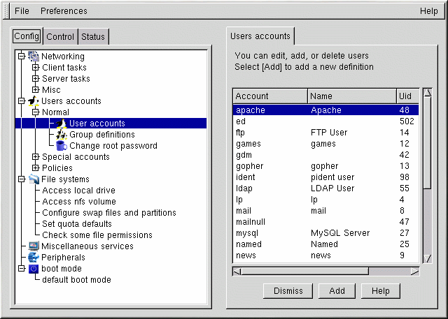 ouvrez Config => Users accounts => Normal => Users accounts. Linuxconf devrait alors afficher un écran de filtre (voir la Figure 14-2).