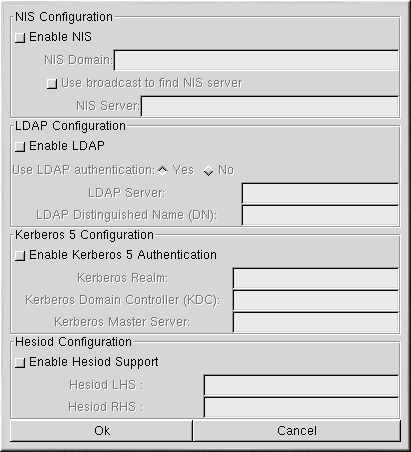 Cliquez sur le bouton Authentication pour activer le support NIS, LDAP, Kerberos 5 et Hesiod. La fenêtre indiquée dans la Figure 2-3 s'ouvre.