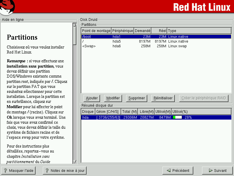 Si vous n'avez pas encore défini la configuration des partitions, reportez-vous à l'annexe du Guide de référence officiel Red Hat Linux. Vous avez besoin au minimum d'une partition root de taille adéquate et d'une partition swap de 32 Mo. |