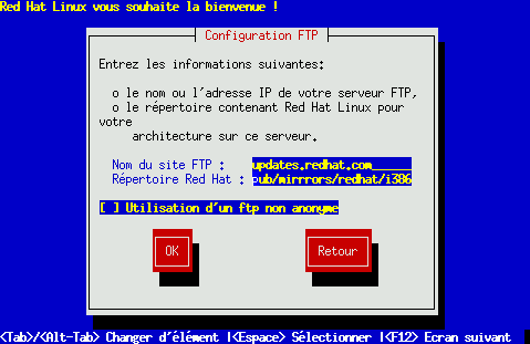 Entrez le nom de domaine pleinement qualifié ou l'adresse IP du site FTP à partir duquel vous faites l'installation et le nom du répertoire sur ce site qui contient les fichiers d'installation RedHat pour votre architecture. Exemple : si le site FTP contient le répertoire /pub/mirrors/redhat/i386/RedHat, entrez /pub/mirrors/redhat/i386.