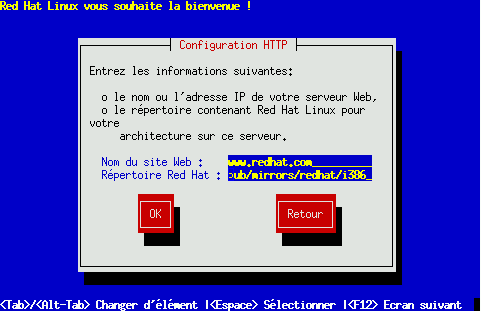 Entrez le nom ou l'adresse IP du site HTTP à partir duquel vous installez Red Hat Linux et le nom du répertoire qui contient les fichiers d'installation RedHat pour votre architecture. Exemple : si votre site HTTP contient le répertoire /pub/mirrors/redhat/i386/RedHat, entrez /pub/mirrors/redhat/i386.