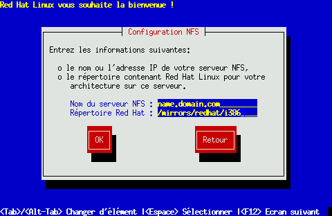 Si le CD-ROM Red Hat Linux du serveur NFS est installé sur /mnt/cdrom, entrez /mnt/cdrom dans le champ Répertoire Red Hat. Si le serveur NFS exporte un miroir de l'arborescence d'installation de Red Hat Linux au lieu d'un CD-ROM, entrez le répertoire qui contient le répertoire RedHat. Exemple : si votre serveur NFS contient le répertoire /mirrors/redhat/i386/RedHat, entrez /mirrors/redhat/i386.