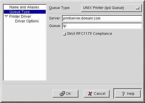 By default, the Strict RFC1179 Compliance option is not chosen. If you are having problems printing to a non-Linux lpd queue, choose this option to disable enhanced LPRng printing features.