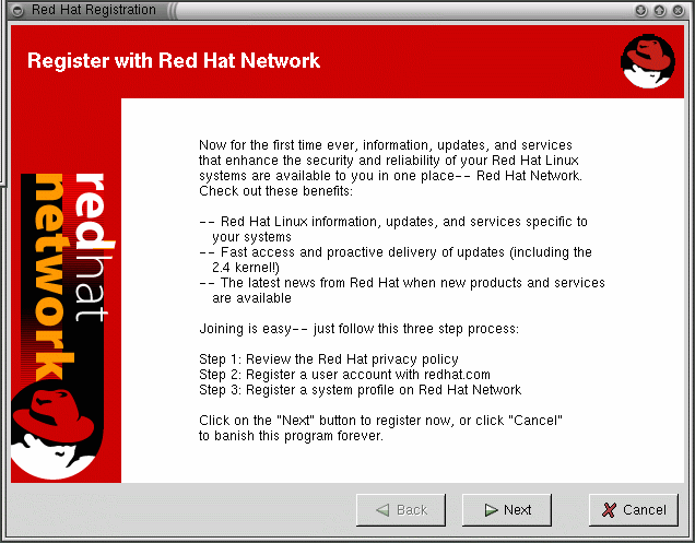 You must be logged in as root (or at least know the root password) to register a system with Red Hat Network. If you start the Red Hat Network Registration Client as a standard user, you will be prompted to enter the root password before you can proceed.
