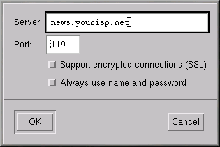 To begin, click on the Add button. In the dialog which opens (see Figure 7-11), enter the newsgroups server information supplied by your ISP.