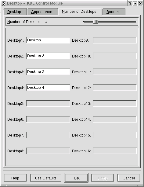 You can increase (or decrease) the number of desktops available to you by adjusting the Visible slider of the Desktops dialog. For more desktops, drag the bar to the right; for fewer desktops, drag the bar to the left. The Desktop, Appearance, and Borders tabs are where you can make various desktop configuration selections, like icon arrangement and font size.
