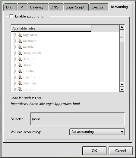 To enable accounting, check the Enable accounting box at the top of the tab. Then select the appropriate region from the list of rules beneath. From the pulldown list next to Volume accounting, select incoming bytes, outgoing bytes, or both.