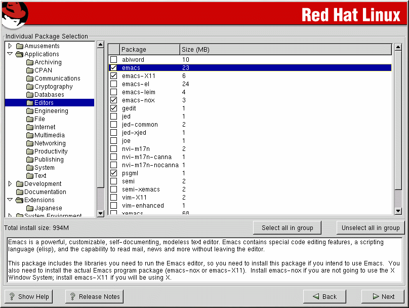 After selecting the components you wish to install, you can select or deselect individual packages. You can select or deselect packages using your mouse (see Figure 4-15).