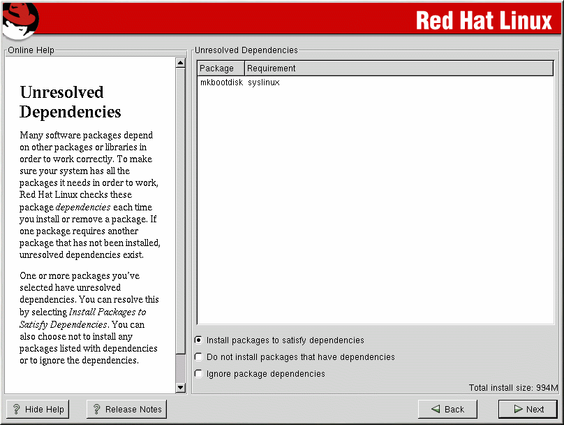 The Unresolved Dependencies screen will only appear if you are missing packages that are needed by the packages you have selected. At the bottom of the screen, under the list of missing packages, an Install packages to satisfy dependencies checkbox is selected by default. If you leave this checked, the installation program will resolve package dependencies automatically by adding all required packages to the list of selected packages.