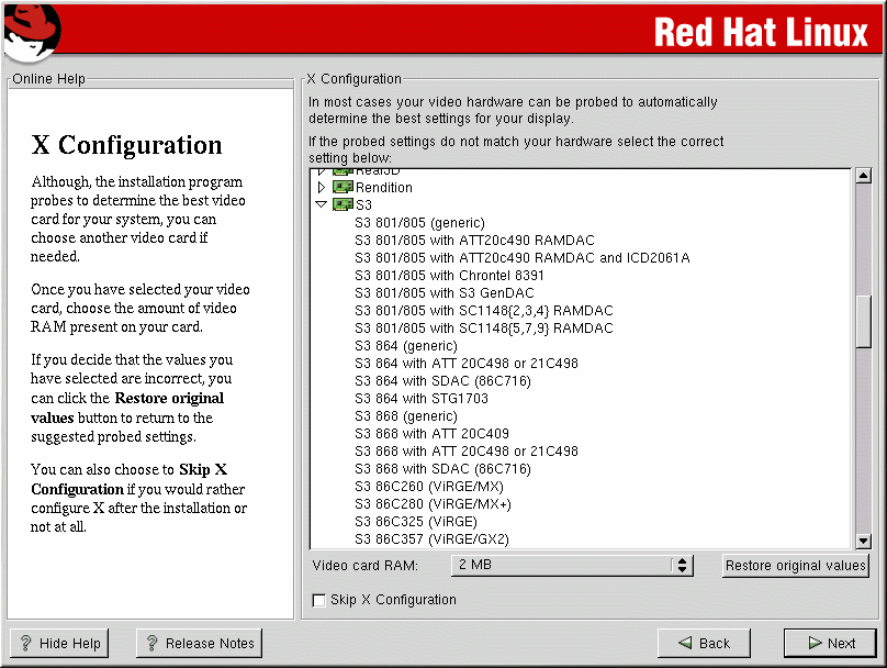 Next, enter the amount of video memory installed on your video card. If you are not sure, please consult the documentation accompanying your video card. You will not damage your video card by choosing more memory than is available, but the X server may not start correctly if you do.