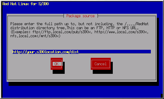 The Red Hat Linux installation program for the S/390 zSeries allows for 3 types of installations: FTP, HTTP, and NFS. Figure 3-6 illustrates the package source dialog. When typing in the location, do NOT include the RedHat directory in the path.
