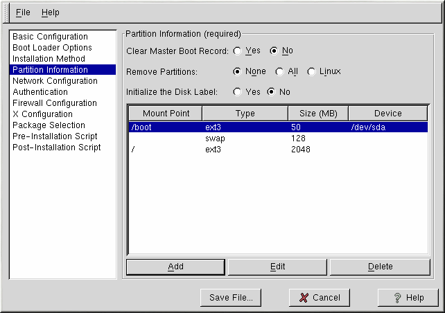 To edit an existing partition, select the partition from the list and click the Edit button. The same Partitions Options window that appears when you add a partition appears, except it contains the values for the selected partition. Modify the partition options and click OK.