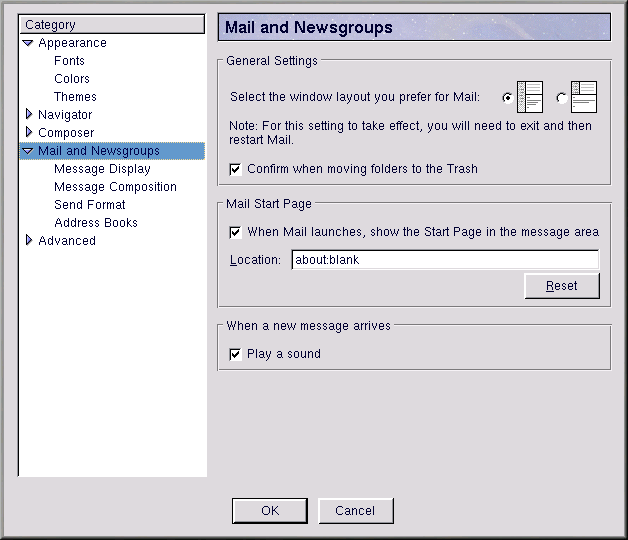 Mail and Newsgroups — Select the window layout for your mail, configure Start Page preferences, and determine whether or not you will be alerted with a sound when new mail arrives.
