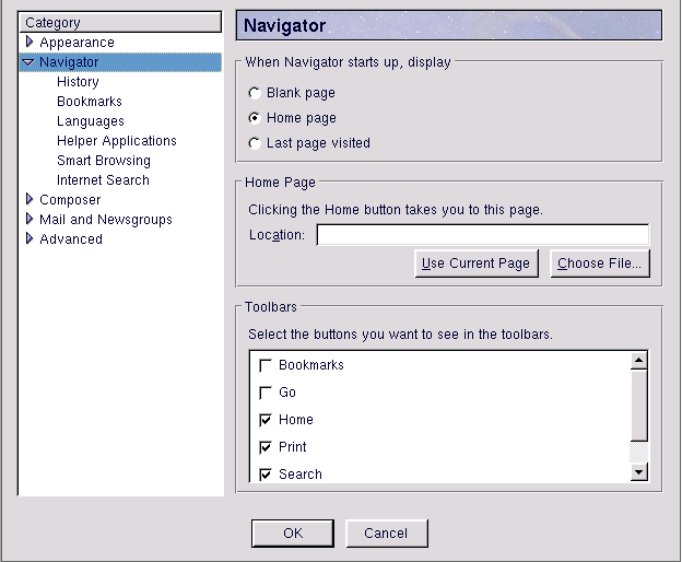 Navigator — Under Navigator you can customize some of your homepage functionality, such as which buttons appear in the toolbar and what, if any, page appears when you launch the application.